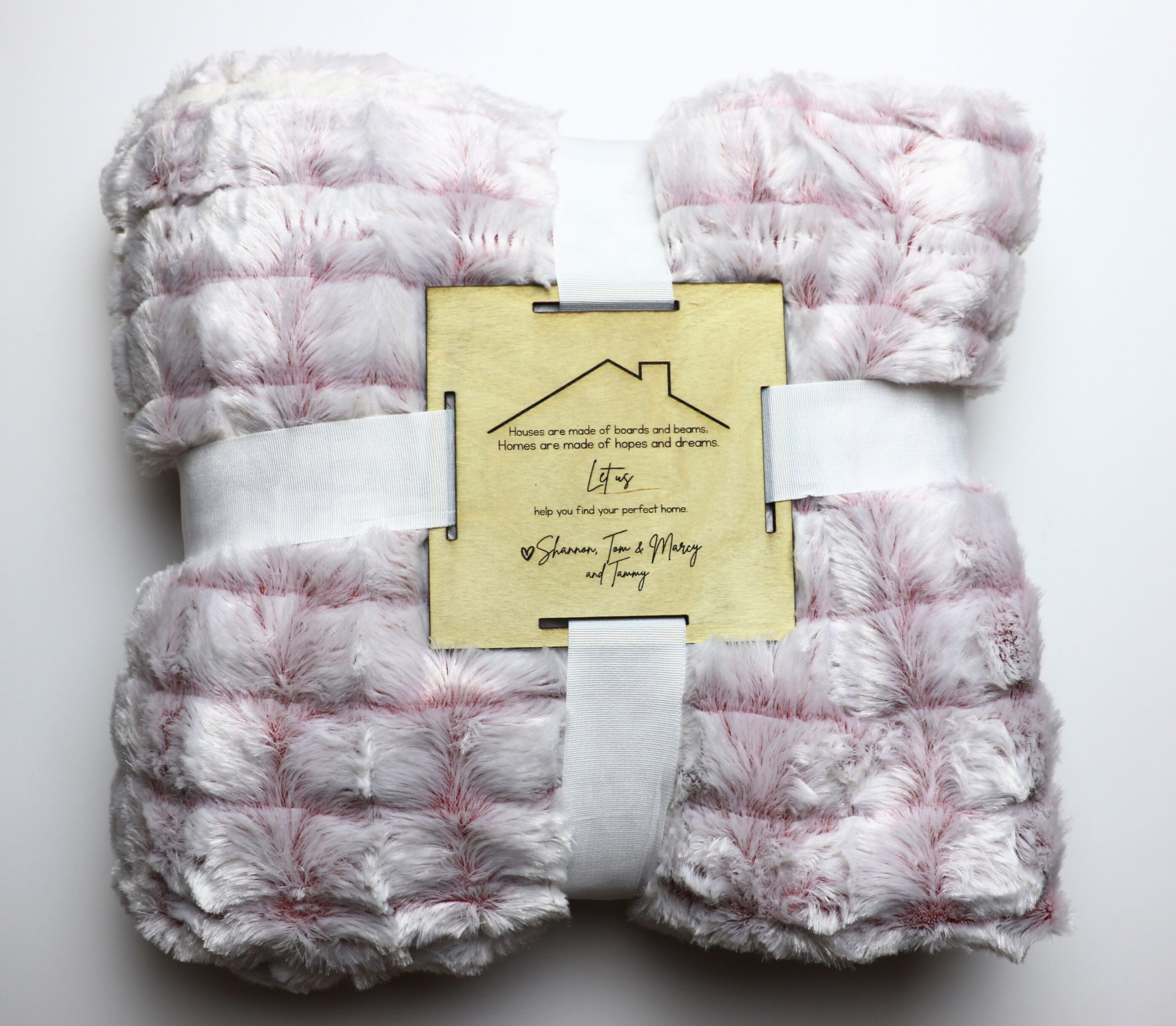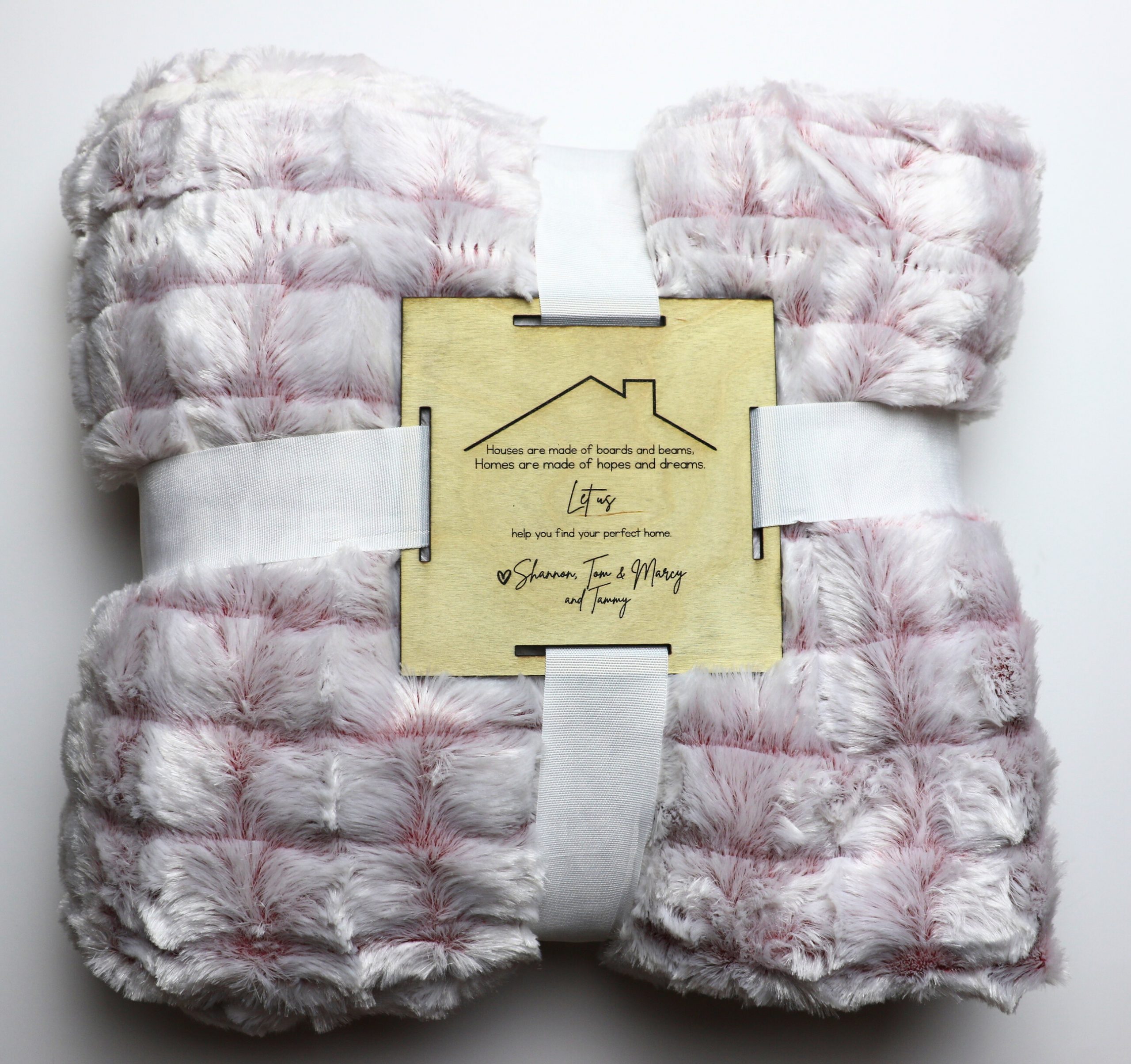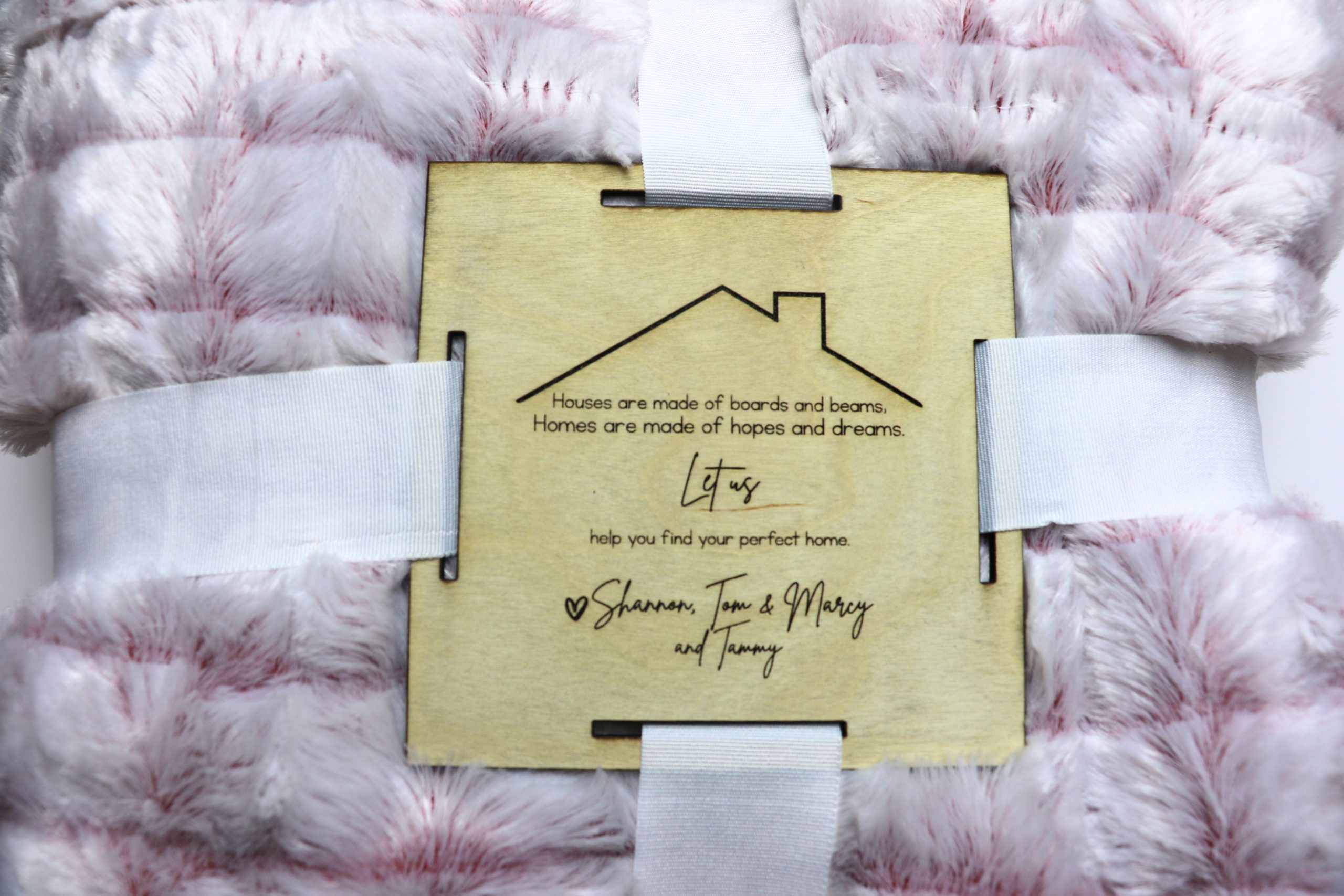 Wrap your loved ones (or clients!) in warmth with this luxurious sherpa blanket featuring a custom engraved tag. Each tag can be personalized with a meaningful phrase, quote, name, date, or even your realtor details to make it a one-of-a-kind keepsake. Realtors can add “Welcome to Your New Home” along with their name, company, and contact information to include in a closing gift basket that clients will treasure.
